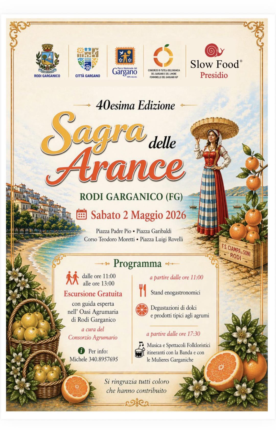 The Orange Festival is much more than a gastronomic event: it is a moment of meeting and sharing that strengthens the deep bond between the Rodi Garganico community and its land, attracting visitors from all over Italy eager to discover oranges famous for their intense perfume and juicy pulp.