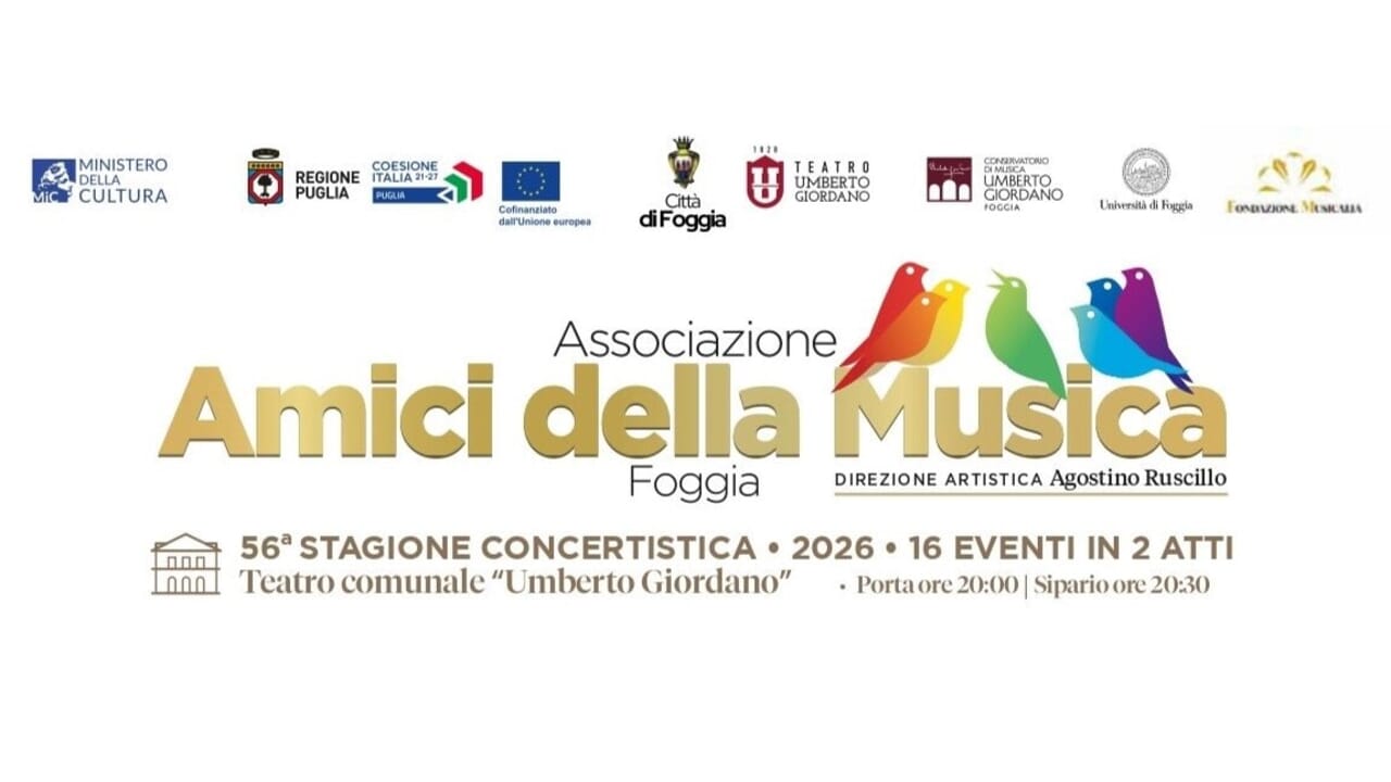 FOGGIA – La 56ª Stagione Concertistica degli “Amici della Musica” di Foggia rinnova il suo storico appuntamento con il pubblico del Teatro Umberto Giordano, il più antico della Puglia, confermandosi come uno dei presìdi culturali più solidi e longevi del territorio.