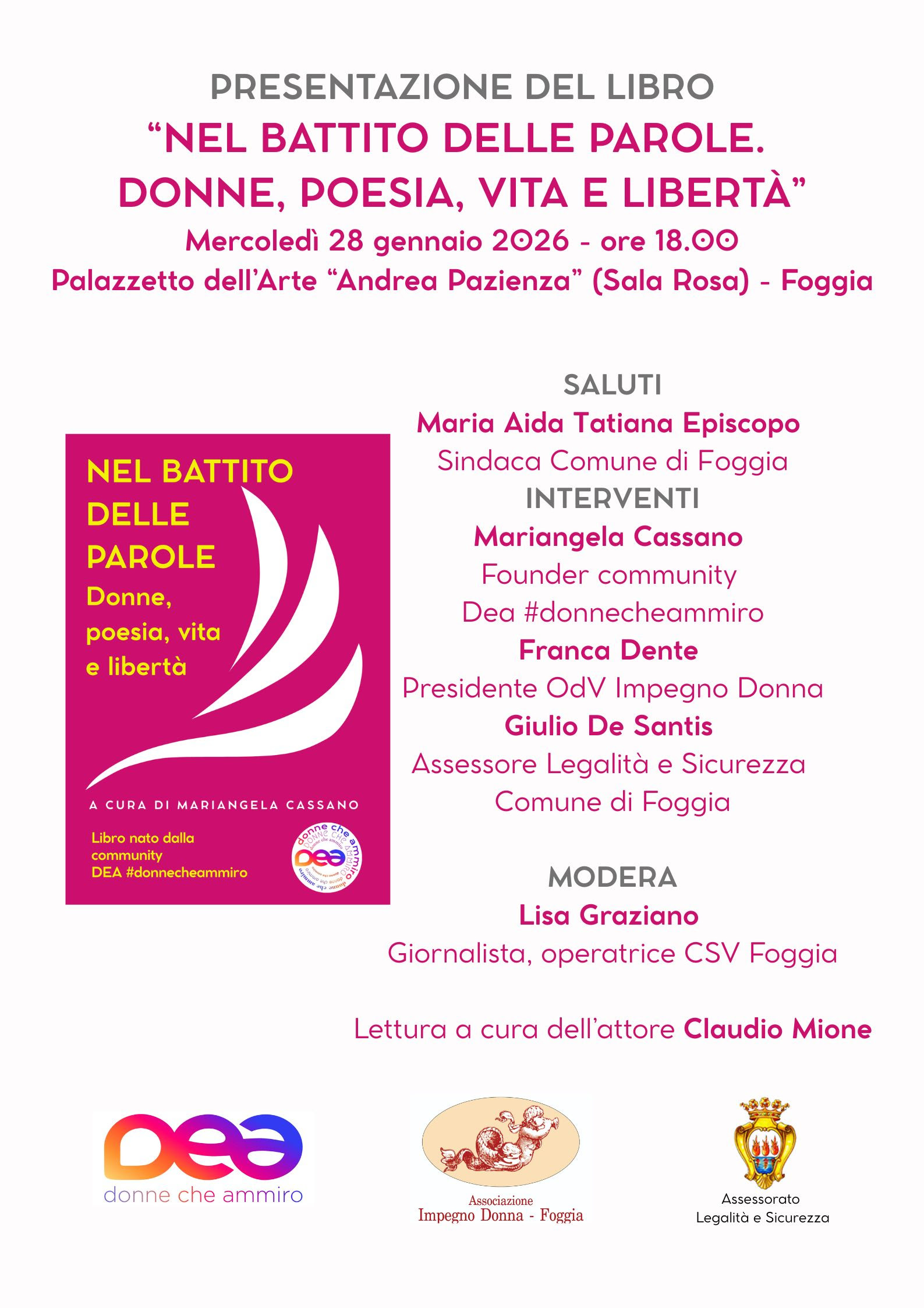 «“Nel battito delle parole” è un momento culturale che ha anche un valore civile: mette al centro le donne, la libertà e la forza della parola come strumento di consapevolezza. Come Comune crediamo che cultura e legalità camminino insieme: una città che dà voce, ascolta e riflette è una città più forte e più giusta», afferma Giulio De Santis, Assessore alla Legalità e alla Sicurezza del Comune di Foggia.