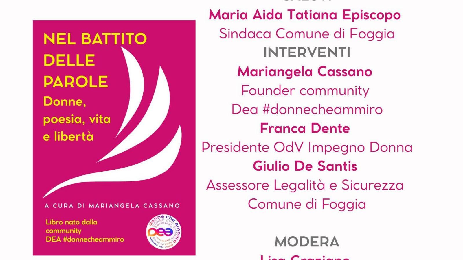 Il libro sarà presentato a Foggia mercoledì 28 gennaio alle ore 18.00 presso la Sala Rosa del Palazzetto dell’Arte “Andrea Pazienza”. Dopo i saluti della Sindaca di Foggia Maria Aida Tatiana Episcopo, interverranno Franca Dente Presidente OdV Impegno Donna, Mariangela Cassano founder community DEA #donnecheammiro, Giulio De Santis Assessore alla Legalità e alla Sicurezza del Comune di Foggia. La lettura delle poesie e di alcuni brani del libro è affidata all’attore Claudio Mione. A moderare l’incontro sarà la giornalista Lisa Graziano.