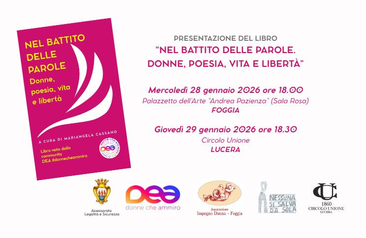 Giovedì 29 gennaio alle ore 18.30 al Circolo Unione di Lucera (in piazza Duomo), dopo i saluti del Presidente Silvio di Pasqua, interverranno Mariangela Cassano e Francesca Vecera, coordinatrice CAV Telefono Donna - OdV Impegno Donna. Le poesie saranno lette da rappresentanti dell’associazione “Insieme per…” capofila del progetto “Nessuna si salva da sola”. A moderare l’incontro sarà la giornalista Danila Paradiso.