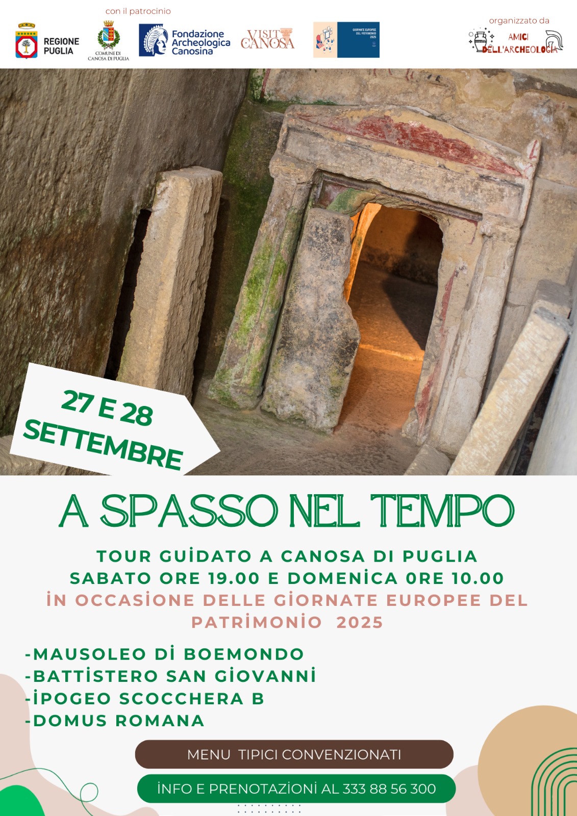 Il 27 e 28 settembre 2025 Canosa di Puglia diventa protagonista delle Giornate Europee del Patrimonio con l’iniziativa “A Spasso nel Tempo”, un affascinante tour guidato tra i luoghi simbolo della storia antica e medievale della città.