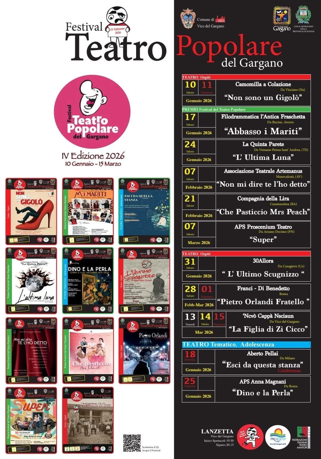 A Vico del Gargano è tutto pronto per la quarta edizione del Festival del Teatro Popolare del Gargano, in programma dal 10 gennaio al 15 marzo 2026 presso l’Auditorium comunale Lanzetta.