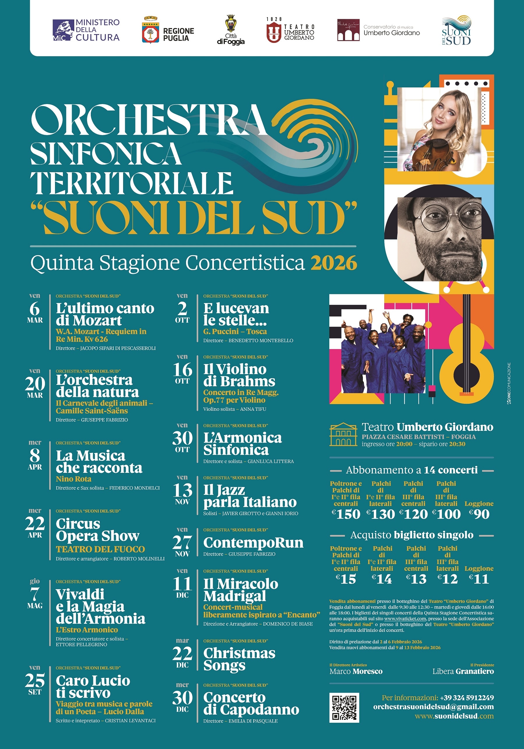 Tutti i concerti inizieranno alle ore 20.30 presso il Teatro Umberto Giordano di Foggia.