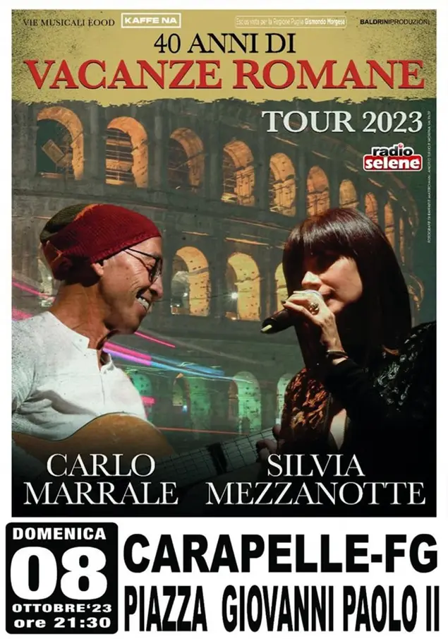 Domenica 8 ottobre alle 21.30 in Piazza Giovanni Paolo II, si esibiranno due pezzi di storia della musica italiana, Carlo Marrale, fondatore dei Matia Bazar ed autore di canzoni come Stasera che sera, Per un'ora d'amore, Cavallo bianco, Che male fa, C'è tutto un mondo intorno, Mr. Mandarino, Vacanze romane, Ti sento.