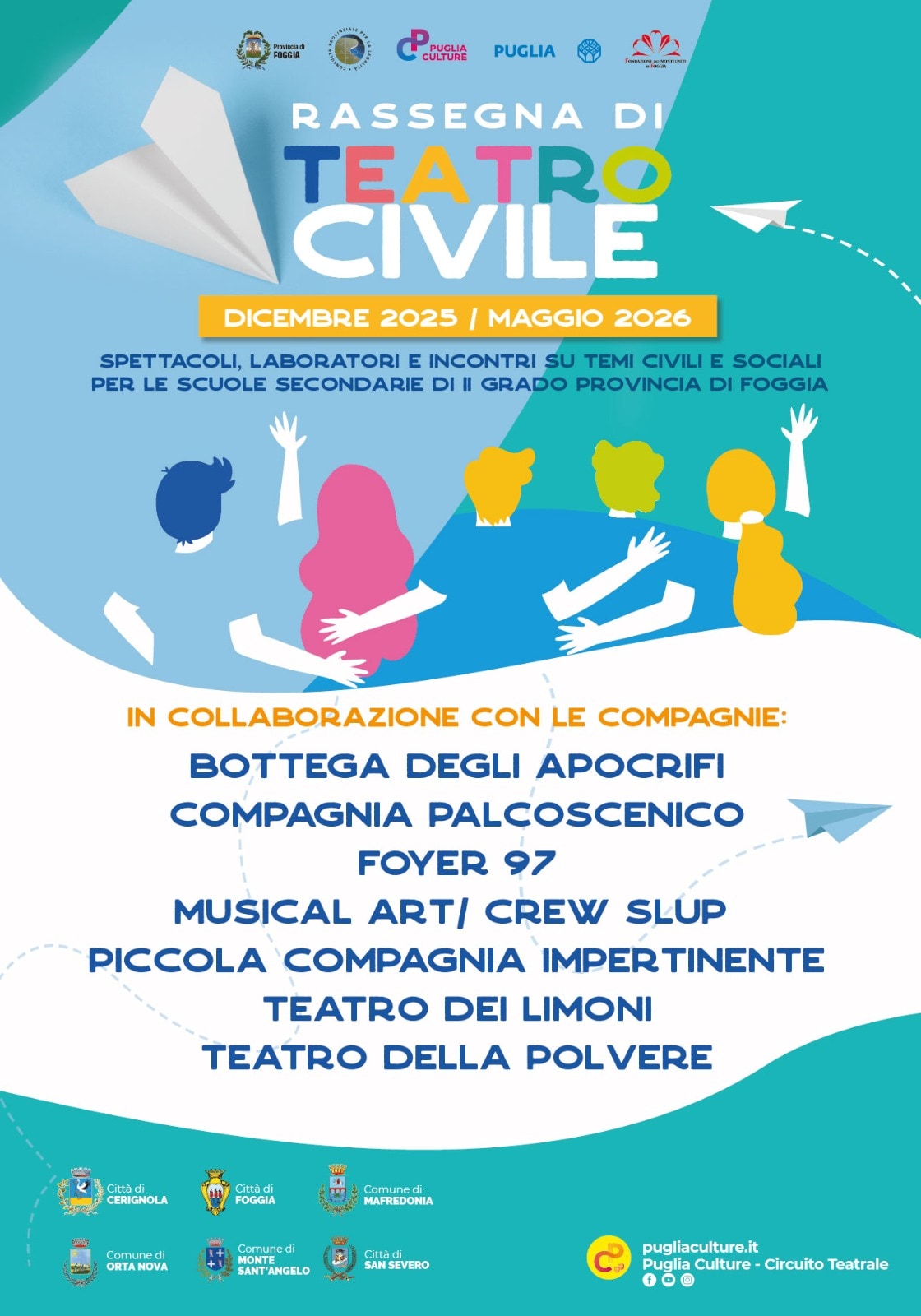 Il progetto non si limita agli spettacoli: sono infatti previsti laboratori, incontri e interventi nelle scuole del Comune di Foggia, realizzati dalle compagnie coinvolte con il supporto di Libera – Presidio di Foggia.