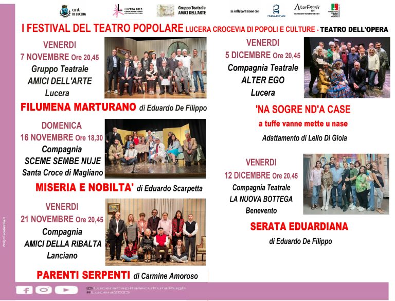 Ad aprire la manifestazione, Venerdì 7 novembre alle ore 20,45, saranno gli Amici dell’Arte di Lucera che porteranno in scena “FILUMENA MARTURANO”, il capolavoro di Eduardo De Filippo con il quale la compagnia lucerina ha partecipato, nello scorso mese di maggio, al Festival Leonessa d’oro di Travagliato, in provincia di Bresca, vincendo il “Gran premio della giuria” per il miglior spettacolo, il premio “Miglior attrice protagonista” assegnato a Lina Carratù r la nomination “Miglior attore protagonista” attribuito a Germano Benincaso.