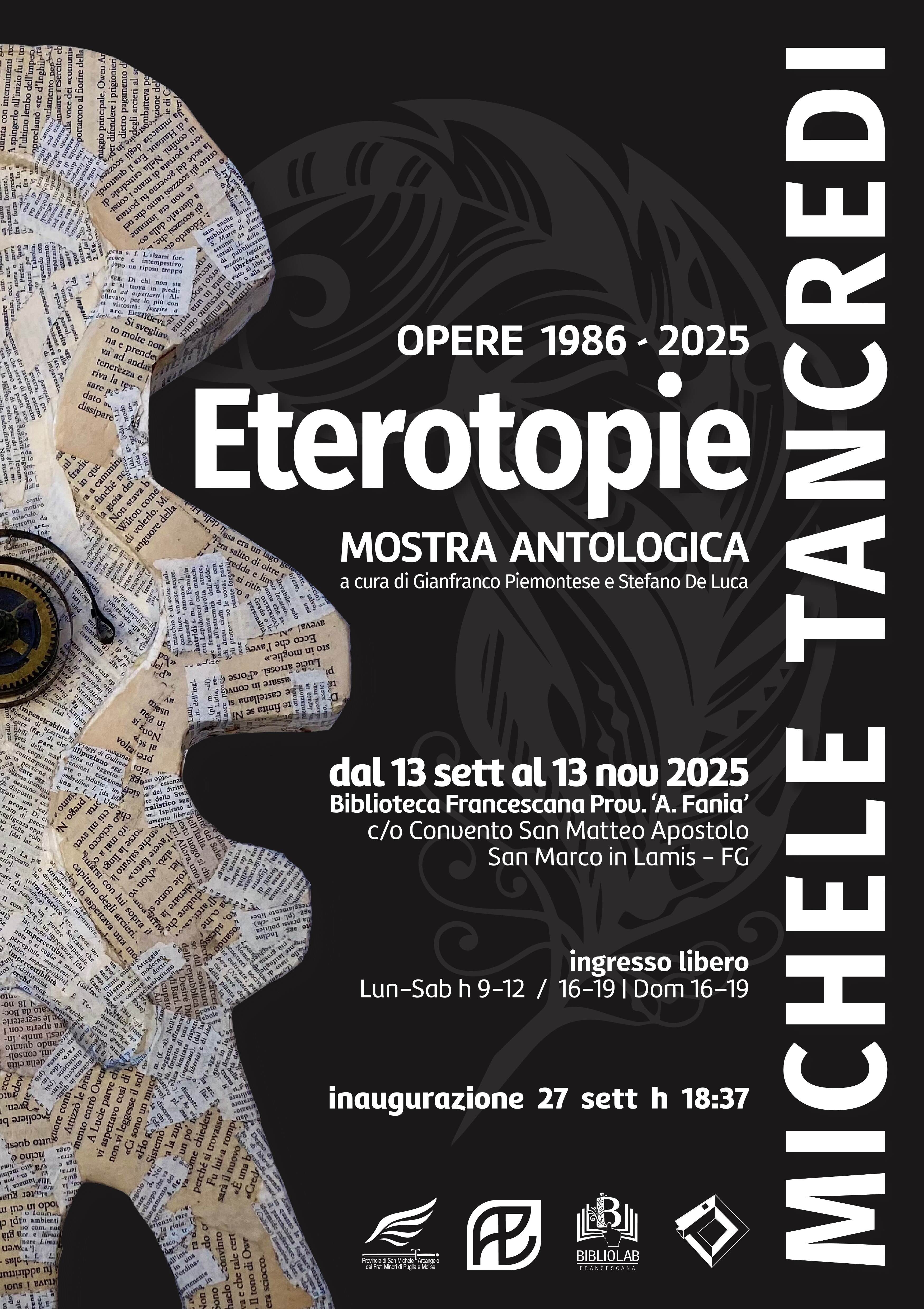 Dal 13 settembre al 13 novembre 2025, la Biblioteca francescana provinciale “P. Antonio Fania”, all’interno del convento-santuario di San Matteo a San Marco in Lamis, ospita la mostra antologica “Eterotopie. Opere 1986-2025” di Michele Tancredi, a cura di Gianfranco Piemontese e Stefano De Luca.