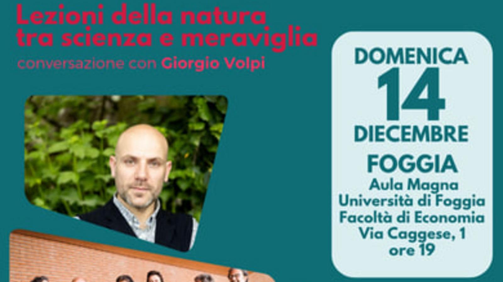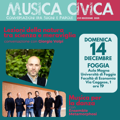 Il 14 Dicembre prosegue l'annuale rassegna Musica Civica del Teatro Giordano con lo spettacolo "Lezioni della natura tra scienza e meraviglia", recitato da Giorgio Volpi accompagnato dall'Ensemble Metamorphosi.