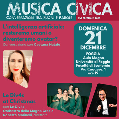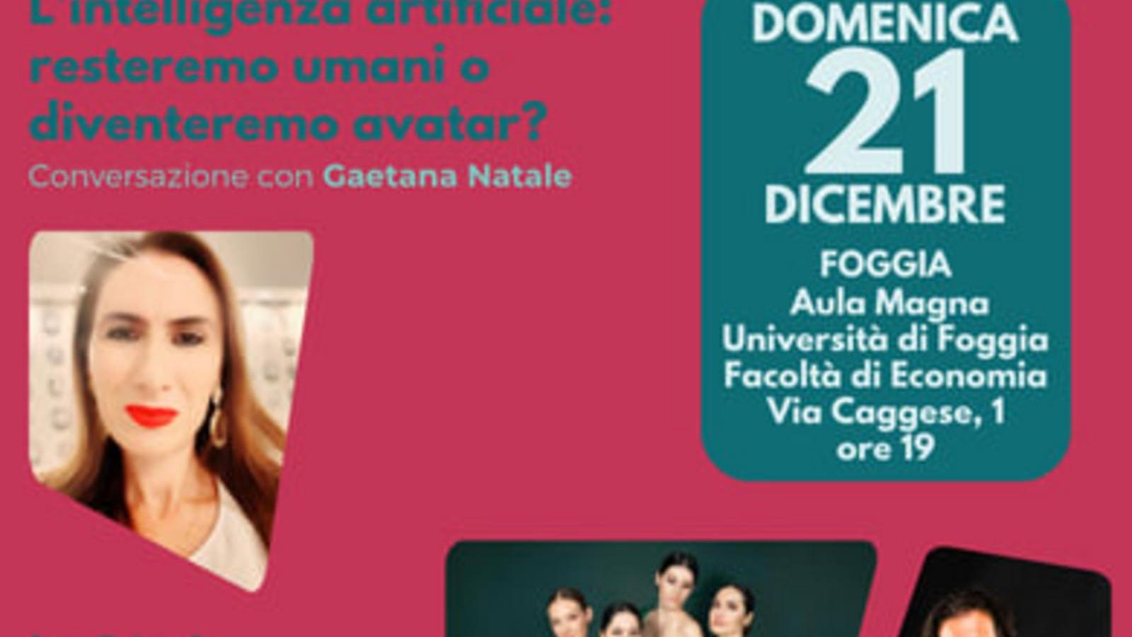 La kermesse Musica Civica del Teatro Umberto Giordano di Foggia presenta lo spettacolo intitolato "Intelligenza artificiale: resteremo umani o diventeremo avatar?", con protagonisti, nella "conversazione tra suoni e parole" come da titolo della rassegna, Gaetana Natale e Roberto Molinelli, accompagnati dalle note dell'Orchestra della Magna Grecia e dai soprani delle Div4s.