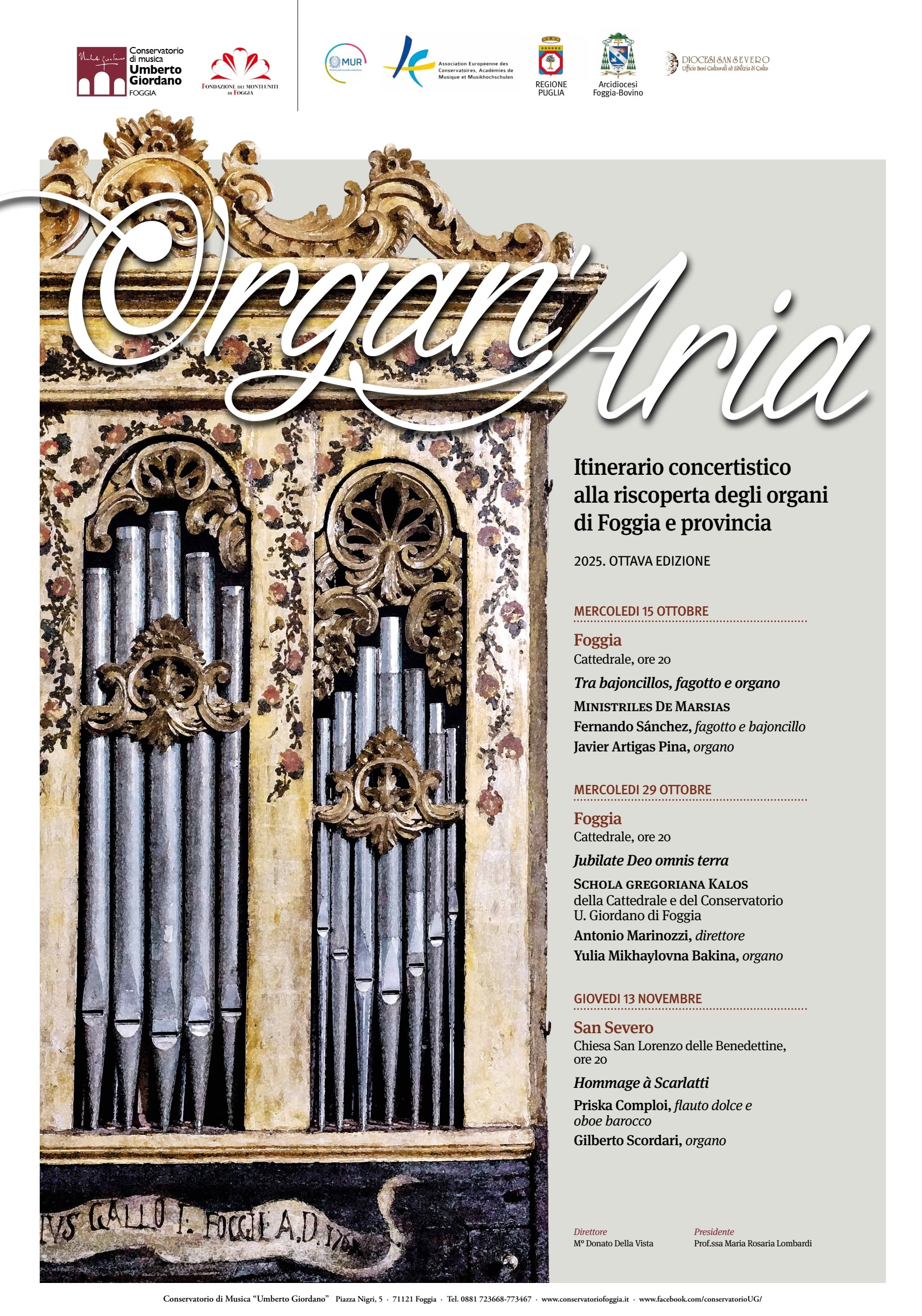 Mercoledì 15 ottobre alle 20:00 si apre in Cattedrale a Foggia l’ottava edizione di Organ’Aria, rassegna del Conservatorio “Umberto Giordano” in collaborazione con la Fondazione dei Monti Uniti, dedicata alla valorizzazione dell’organo storico nel territorio. L’edizione 2025 prevede tre appuntamenti, due a Foggia e uno a San Severo, tutti a ingresso libero fino a esaurimento posti.