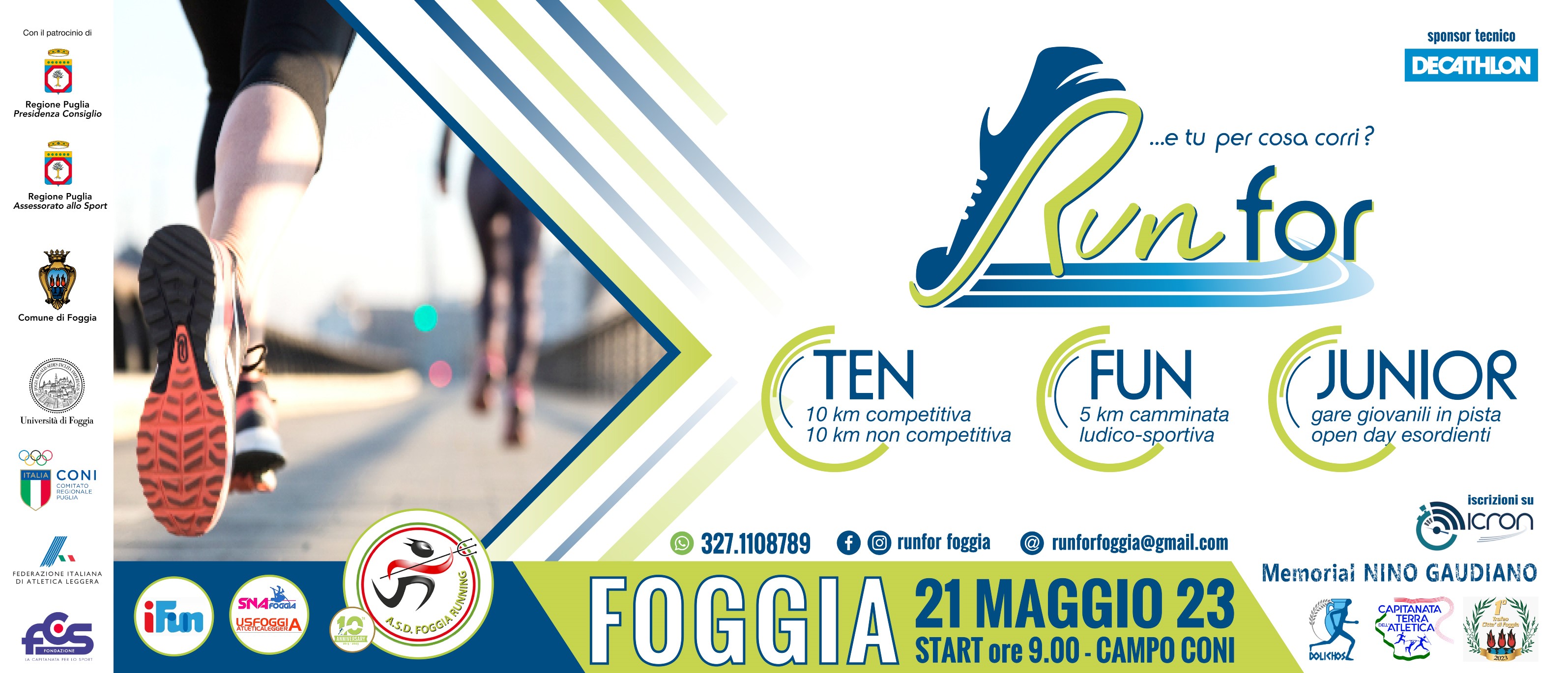 Per celebrare il suo primo decennale, la ASD Foggia Running ha organizzato la prima edizione della Run For che si terrà Domenica 21 maggio 2023, Manifestazione Sportiva articolata su tre tipologie di corse.