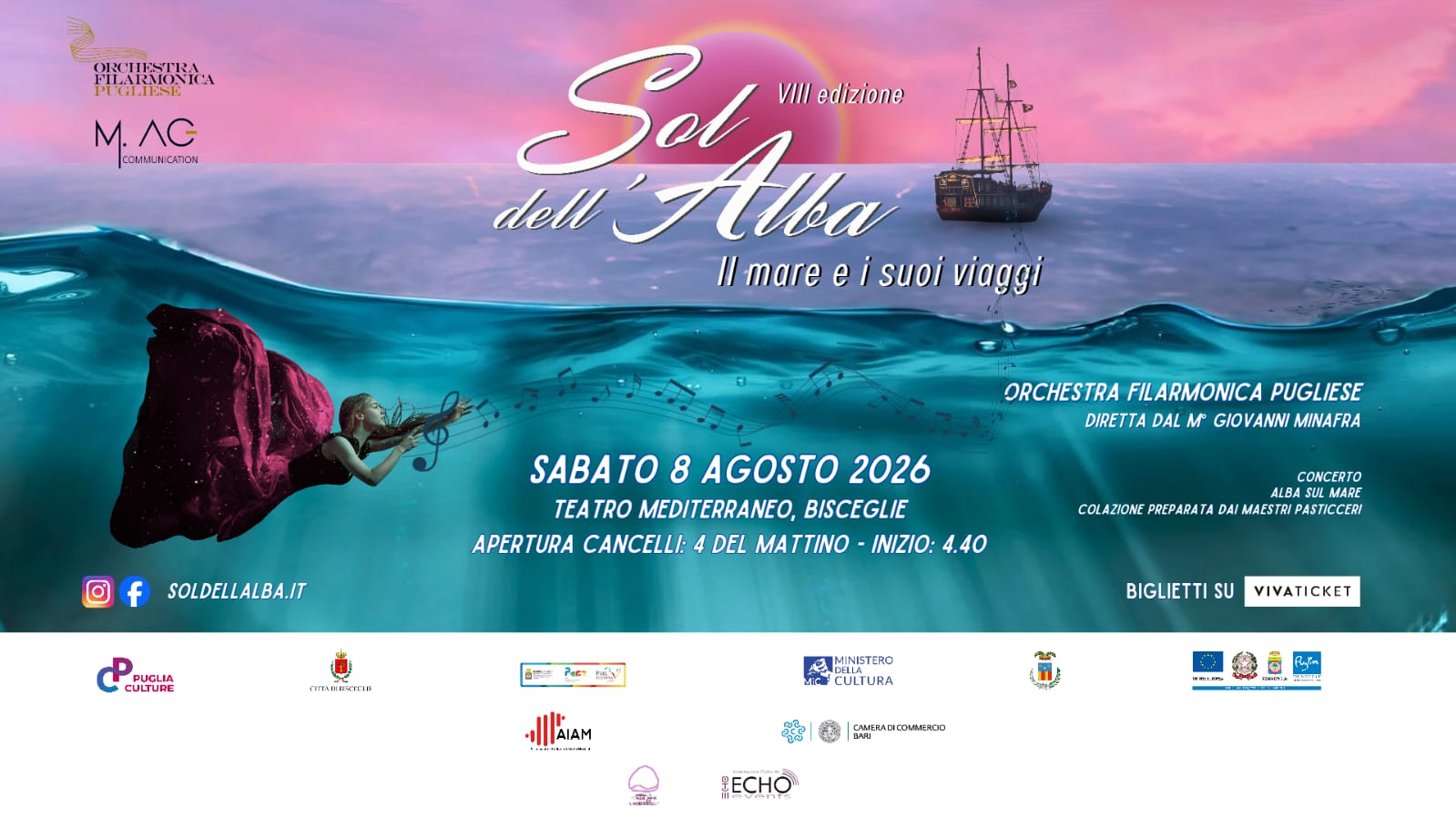 Spiegare le vele e lasciarsi trasportare dalla musica, mentre il giorno nasce sul mare. Sabato 8 agosto 2026, il Teatro Mediterraneo ospiterà “Sol dell’Alba – Il Mare e i Suoi Viaggi”, un’esperienza unica che unisce la potenza evocativa della musica orchestrale alla suggestione delle prime luci del giorno.