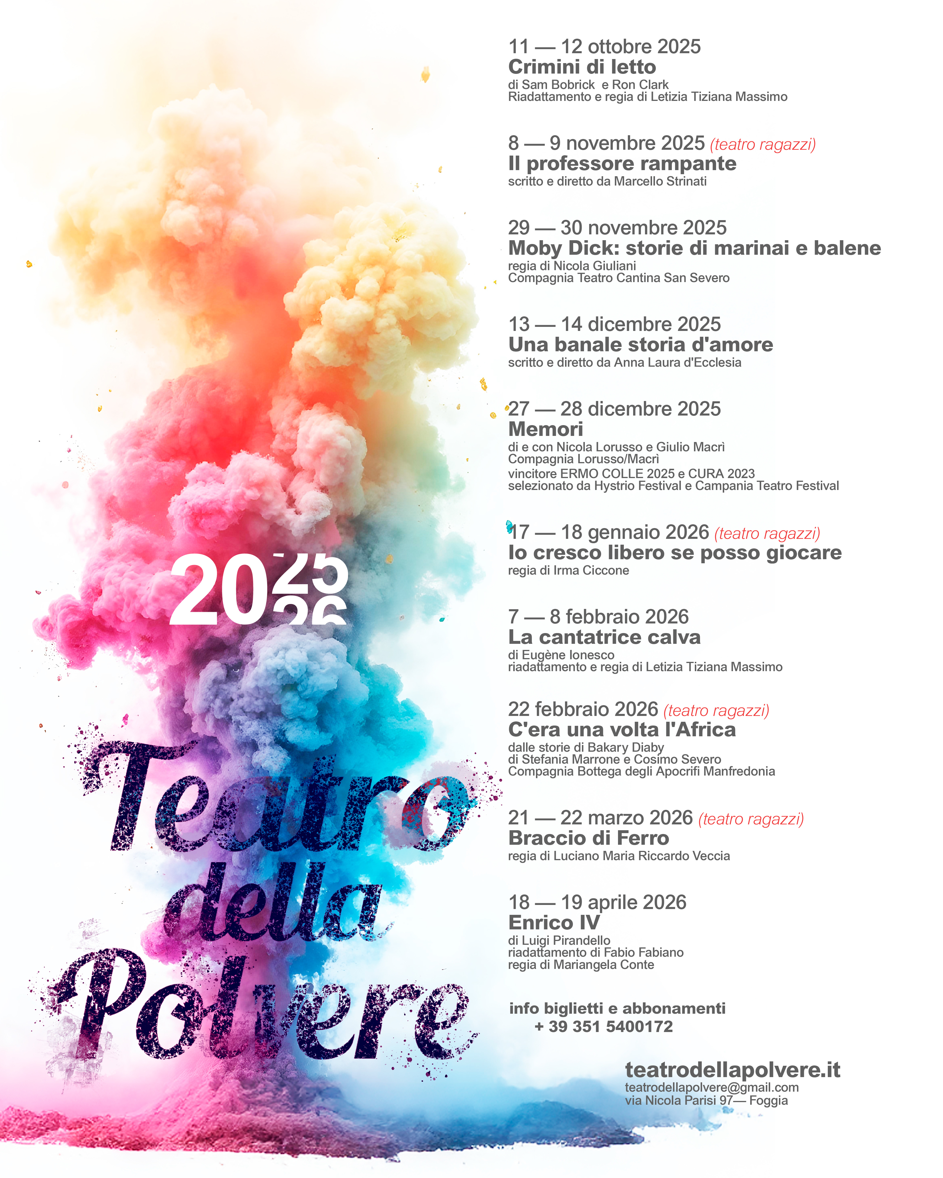 Un’immagine che esplode in volute di colore apre la nuova stagione del Teatro della Polvere di Foggia: non il grigio della polvere, ma i colori della pace. Una dichiarazione di intenti per un cartellone che intreccia teatro civile e poesia scenica, nuove produzioni e ospitalità, con attenzione speciale al pubblico dei ragazzi. Un teatro indipendente che si rinnova con coraggio, come atto d’amore verso la città e la sua comunità.